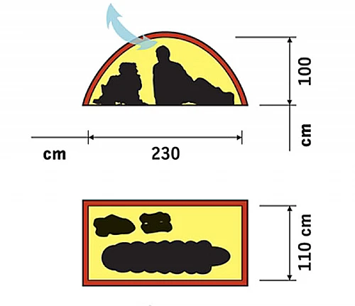 Mehrere Reißveschlussläufer an den Eingängen des Innen- wie Außenzeltes lassen eine gute Regulierung der Belüftung zu. Eine separate Lüfterhaubeauf dem Dach schützt die Lüfteröffnungen vor Regen und Schnee. Bei gutem Wetter kann das Außenzelt vorne wie hinten für noch bessereBelüftung etwas hochgerollt werden - Abspannungen:Der Aufbau erfordert keine Heringe, aber 12 Befestigungspunkte stehen bei Bedarf zur Verfügung: an den Ecken, für die beiden doppelten Leinenbefestigungen an jeder Stange sowie die beidseitigen Abspannleinen und Heringsringe in der Mitte der hinteren Langseite und dem vorderen Eingang.