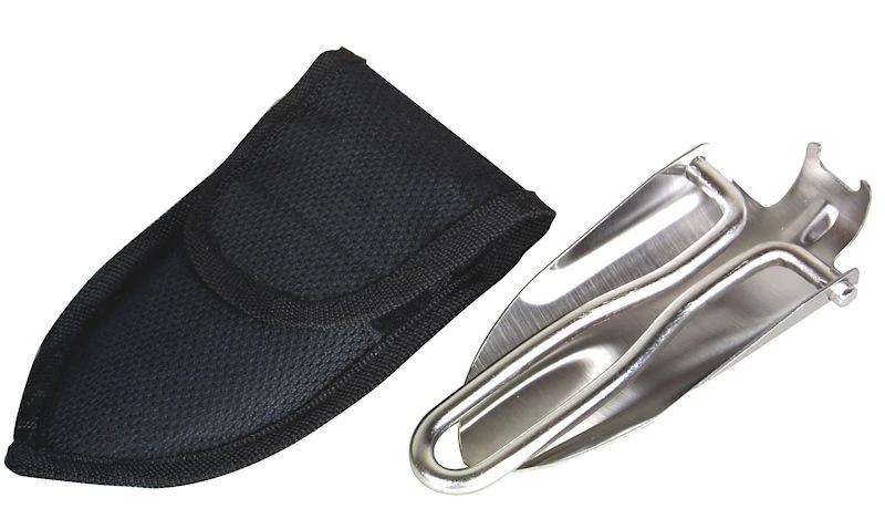 - Diese Mini-Faltschaufel kann zusammengeklappt im stabilen Cordura-Etui transportiert werden. Das Etui hat eine Gürtelschlaufe.