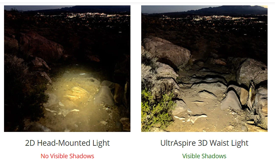 Die auf Taillenhöhe getragene Lampe bietet beim Gehen und vor allem Laufen deutliche Vorteile gegenüber einer normalen Stirnlampe, weil sie Geländeunebenheiten per Schatten deutlicher erkennen lässt.
